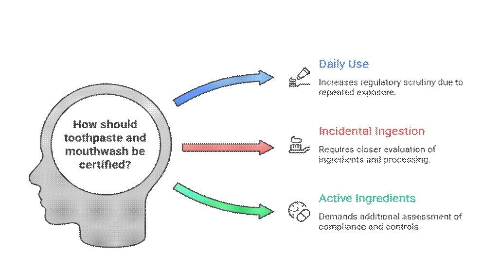 Toothpaste and mouthwash are used daily, often multiple times per day, which increases regulatory and certification scrutiny compared to occasional-use oral-care products.